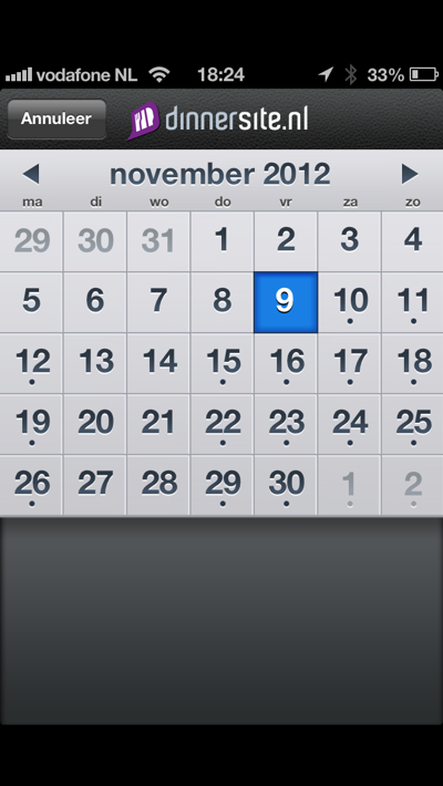 - Een stipje bij een datum geeft aan dat het restaurant geopend is.