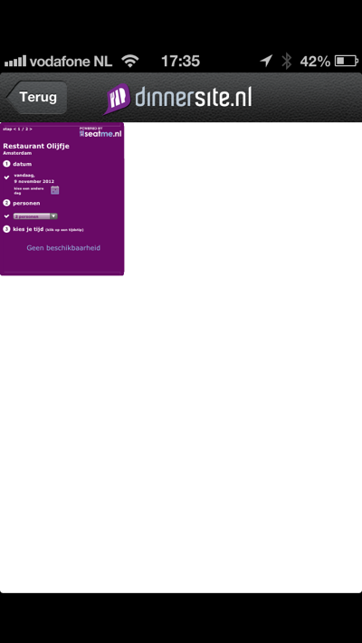 Dinnersite heeft wel een voordeel ten opzichte van de SeatMe-app: het aanbod aan restaurants is veel groter, ook buiten de Randstad. Wil ik komende dinsdag in Eindhoven uit eten gaan, dan heb ik bij SeatMe keuze uit 15 restaurants en bij Dinnersite meer dan 100 restaurants. Alleen heb ik inmiddels twijfels gekregen in hoeverre ze nou echt beschikbaar zijn. Bovendien heeft Dinnersite geen uniforme weergave. Bij het ene restaurant krijg je een blokkenschema met reserveringen, bij het andere een heel klein formuliertje. Of je krijgt te maken met een onverwachte verrassing: probeer je bijvoorbeeld de ART Brasserie in Amsterdam te reserveren en druk je op de knop ‘Reserveer nu!’ dan word je plotseling uit de app geknikkerd en zonder verdere waarschuwing naar de App Store doorgestuurd. Daar krijg je de SeatMe-app voorgeschoteld, die je blijkbaar moet installeren om bij dit restaurant te kunnen reserveren.