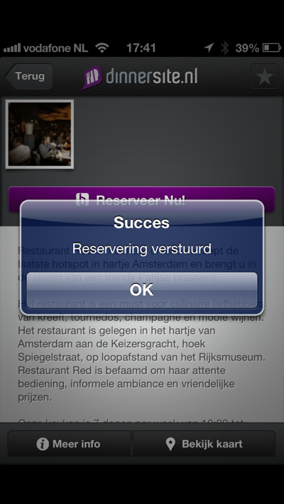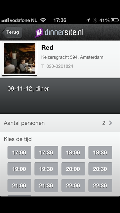 De Dinnersite-app pakt het iets anders aan. Je geeft aan op welke datum en in welke plaats je wilt eten. Je kunt bij het filteren geen tijdstip kiezen, maar wel grofweg aangeven dat je voor lunch of diner een tafeltje wilt reserveren. Het populaire restaurant Red in Amsterdam is vaak al dagen van tevoren volgeboekt en is via de eigen website en via de Dinnersite-website pas vanavond vanaf 22:00 uur te reserveren. Maar de Dinnersite-app geeft aan dat de hele avond nog tafeltjes vrij zijn, zelfs op gewilde tijdstippen. We hebben daarom vanmiddag tweemaal om 20:00 uur gereserveerd bij dit restaurant. Er kwam in beide gevallen geen reserveringsbevestiging via e-mail binnen. Toen we het restaurant belden om de twee reserveringen te checken bleken ze niet aangekomen. Sterker nog: de medewerker van Restaurant Red gaf aan dat ze helemaal niet met Dinnersite (en ook niet met andere reserveringssites) samenwerken.