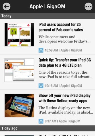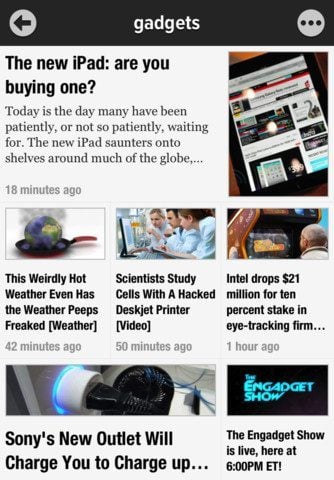 Er is nog een aardigheidje van de artikelpagina: door de onderkant van een artikel naar boven te duwen, zie je meteen het volgende bericht in beeld komen. Dat is een trucje dat Newsify dankbaar leent van Reeder, een app die door velen nog steeds wordt gezien als de beste Google Reader-applicatie op de iPhone. Die titel kan door Newsify wel eens in gevaar komen: deze nieuwe app is ter introductie 2,39 euro goedkoper en is net zo overzichtelijk, maar ziet er wel een stuk frisser uit.