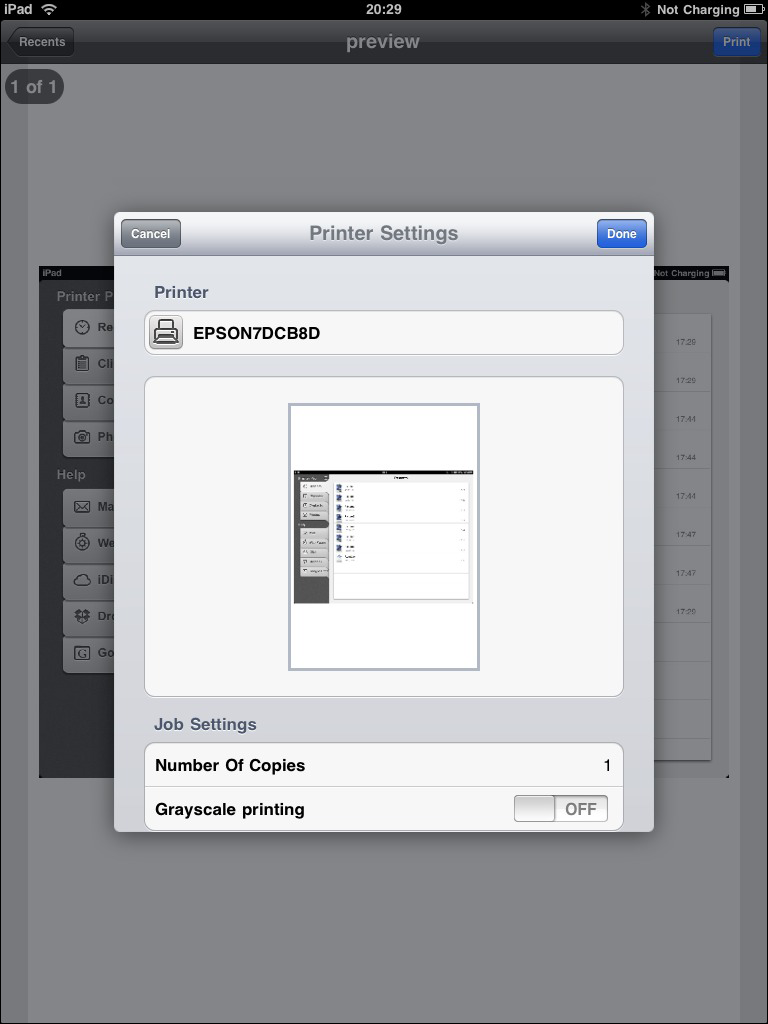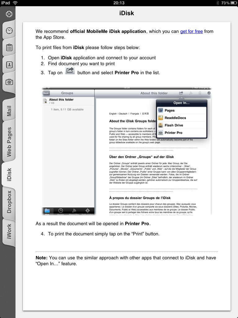 Omdat een externe ontwikkelaar geen toegang krijgt tot applicaties om vanuit daar direct te kunnen printen zitten er een aantal slimme trucjes ingebouwd in Printer Pro. Alle applicaties die de mogelijkheid bieden om een document te openen in een andere applicatie krijgen de app Printer Pro in het menu erbij. Zo kun je printen vanuit diverse Office-applicaties, maar ook vanuit bijvoorbeeld iDisk en Dropbox.