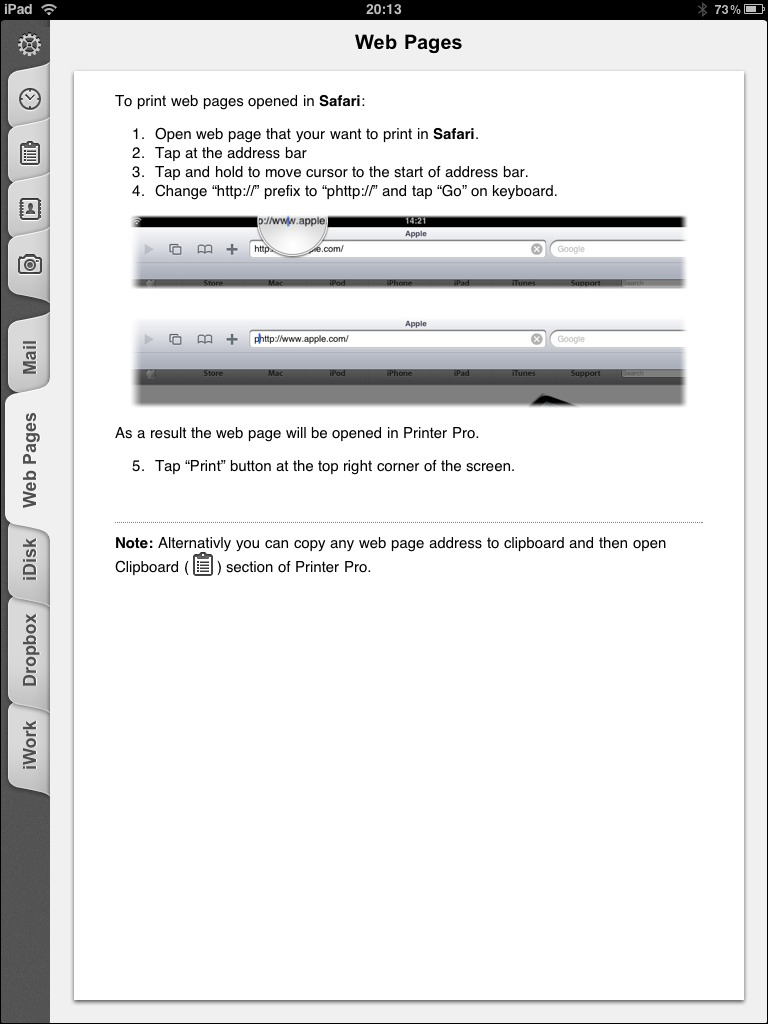 Daarnaast kun je webpagina’s printen door een p voor het internetadres te zetten in Safari. phttp://-adressen worden namelijk geopend in Printer Pro. Uiteraard kun je ook dingen die op je klembord staan printen vanuit de applicatie. Printer Pro ondersteunt de volgende bestandsformaten: PDF, Word, Excel, Powerpoint, Pages, Numbers, Keynote, TXT, HTML, JPG en Safari webarchive.