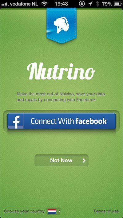 - Openingsscherm van Nutrino. De Facebook-inlog is gelukkig niet verplicht.