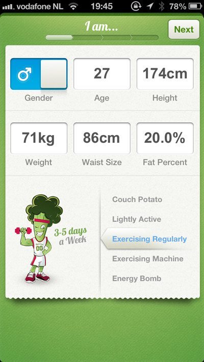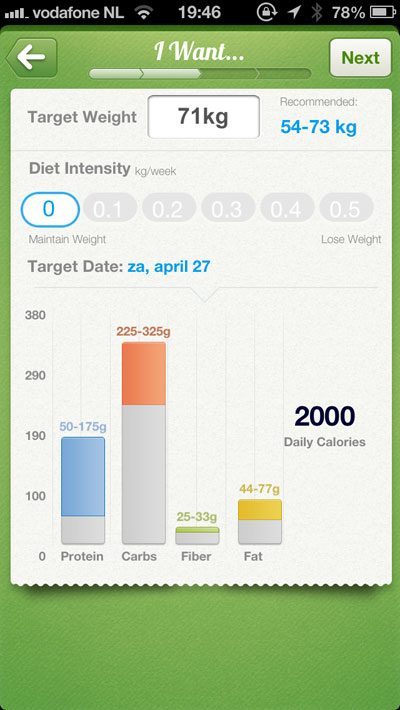 Bij het opstarten toon Nutrino een grote Facebook-knop, die je gelukkig kunt negeren. Je kunt op het openingsscherm ook meteen je land kiezen, bijvoorbeeld Nederland. Vervolgens kom je terecht op een scherm waar je je lichaamsgegevens moet invullen: geslacht, leeftijd, lengte, gewicht, tailleomvang en vetpercentage. Met een grappige cartoon geef je aan hoe actief je bent, waarbij je 5 keuzemogelijkheden hebt: van inactief (couch potato) tot energiebom. Je bladert verder naar het scherm waarop je je streefgewicht en de intensiteit van je dieet kunt instellen. Wie 100 gram per week wil verliezen, kan dat. Het maximum is een halve kilo per week, zodat je met deze app niet echt kunt spreken van een crashdieet. Nutrino geeft vervolgens een aanbeveling: in mijn geval om 2.000 calorieën per dag te eten, bestaande uit 225-325 gram koolhydraten, 50-175 gram eiwit en 44-77 gram vet. Helaas is het niet mogelijk om bepaalde eetwijzen te kiezen, bijvoorbeeld weinig koolhydraten en meer vet, wat ik liever had gezien. Je zit daardoor vast aan het tamelijk traditionele (en inmiddels wat achterhaalde low fat-eetadvies. Maar goed, het is hier niet de plek om dieetinzichten op de proef te stellen en verderop in de app komt het gelukkig alsnog goed.