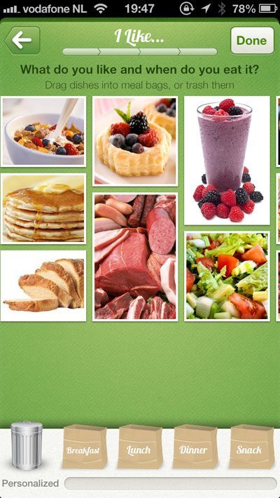 Je bent nog niet helemaal klaar. Sterker nog, het echte werk komt straks pas. Om te beginnen moet je aangeven welke maaltijden voor jou het belangrijkst zijn. Krijg je tijdens het ontbijt maar weinig naar binnen, dan zet je de schuifknop naar links. Ben je iemand die vooral tijdens de lunch flink gaat bunkeren, dan gaat de schuifknop naar rechts. Je kunt ook aangeven om de drie snacks die je tussen de maaltijden door eet groot of klein qua hoeveelheid moeten zijn. Zo kun je het eetadvies afstemmen op je eigen eetlust. Bovendien kun je per maaltijd aangeven of je zelf kookt, een kant-en-klaarmaaltijd in de magnetron gooit, een afhaalmaaltijd neemt of naar een restaurant gaat. Leuk bedacht, maar het werkt nog niet en je hebt ook niet de mogelijkheid om dan maar handmatig de voedingswaarde van je buitendedeur-maaltijd in te voeren. Op een apart scherm geef je aan of je vegetariër bent. Binnenkort komen de opties veganist, glutenvrij en melkproductenvrij erbij.