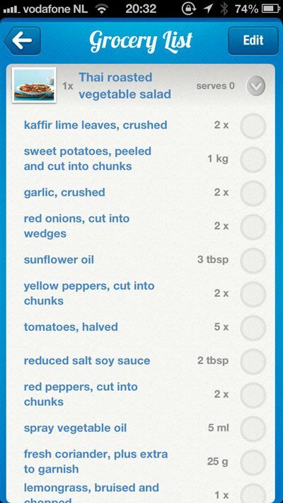 Eet je een maaltijd wel, dan geef je dat aan in de app. Je kunt ook meteen de benodigde boodschappen op een lijstje zetten. Bij elk recept staat het aantal calorieën en het aantal carbs. Bij sommige recepten is er zelfs een knop om de boodschappen online te kopen, maar ook dat is een functie die (nog) niet werkt. De recepten gaan bovendien uit van 4 personen, wat nogal vreemd is als je bedenkt dat de eetadviezen juist heel erg persoonlijk zijn. Die flexibiliteit biedt de app niet en bij het doen van boodschappen zul je dan ook rekening moeten houden met kleinere hoeveelheden. Je kunt ook geen boodschappenlijstje maken op weekbasis, want je weet niet welk eetadvies je morgen krijgt.