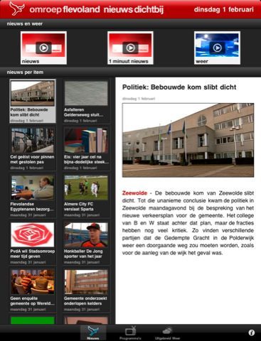 Omroep FlevolandOmroep Flevoland heeft deze week als een van de eerste regionale omroepen een eigen iPhone-applicatie gelanceerd. De applicatie biedt onder meer nieuwsberichten en video’s van nieuws- en sportgebeurtenissen. Bovenin de applicatie, die in portret- en landschapsweergave te gebruiken is, vind je het laatste nieuwsbulletin, het 1 minuut nieuws en het meest recente weerbericht terug. Opvallend is dat er is gekozen om de video’s niet schermvullend te laten weergeven.