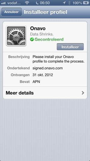 Als je de iPhone-app installeert moet je ook de installatie van een nieuw profiel accepteren, die zo te zien je APN-instellingen aanpast. Vervolgens zie je… helemaal niets. De app heeft wat tijd nodig om data te verzamelen. Na een paar uur je iPhone te hebben gebruikt komen de eerste cijfers binnen. Je zult verbaasd zijn hoeveel data je op een dag gebruikt, zeker als je apps buitenshuis downloadt, buiten het bereik van een Wi-Fi-netwerk.