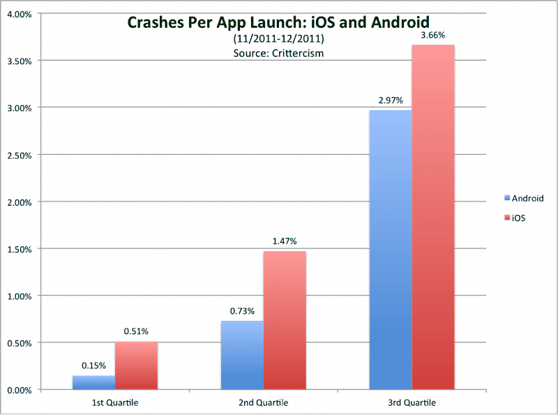 Het grote aantal crashes onder iOS is volgens Crittercism te wijten aan iOS 5: Apple bracht in oktober een nieuwe firmwareversie uit, die in één keer door veel gebruikers met een iPhone 3GS, iPhone 4, iPhone 4S, iPad, iPad 2 en derde of vierde generatie iPod touch geïnstalleerd werd. Ondertussen moesten er veel apps door ontwikkelaars worden geoptimaliseerd voor iOS 5, om ervoor te zorgen dat ze niet zomaar crashen. De balans zal wellicht verschuiven zodra Android 4.0 Ice Cream Sandwich voor meer Android-telefoons beschikbaar is.