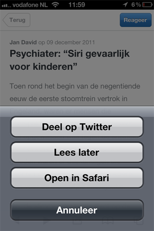 - Delen van een artikel via Twitter of opslaan voor later.