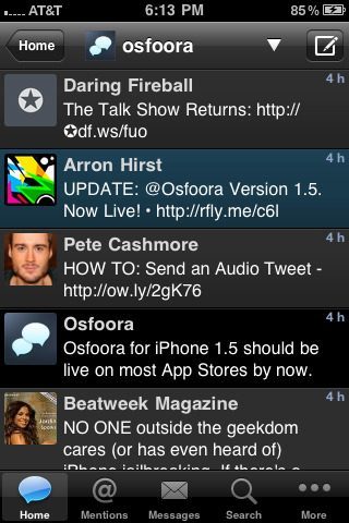 Said M. Marouf, in het dagelijkse leven student, heeft vandaag een nieuwe versie van zijn Twitter-client Osfoora uitgebracht. Het is een van de meest uitgebreide Twitter-clients voor de iPhone. In versie 1.6 is er ondersteuning toegevoegd voor meer foto- en videodiensten. Zo is het nu mogelijk om vanuit de applicatie foto’s en video’s te uploaden naar MobyPicture, evenals het uploaden van foto’s naar Twitgoo. De bestaande fotodiensten zijn bijgewerkt zodat ze goed samenwerken met OAuth, de nieuwe authorisatiemethode van Twitter.