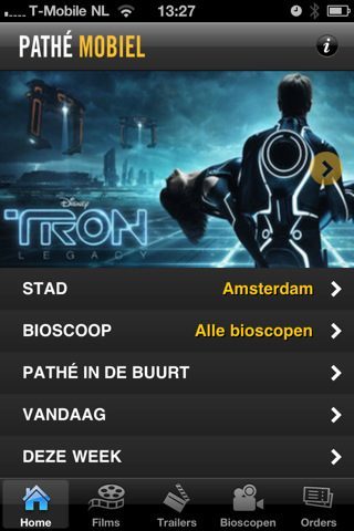 Op het beginscherm vind je nu bovenaan een filmbanner van een film die binnenkort in de bioscoop draait met daaronder opties voor Stad, Bioscoop, Pathé in de buurt, Vandaag en Deze week. Om filmtijden van vandaag of deze week te bekijken, moet je voortaan eerst bij Bioscoop aangeven van welke bioscoop je de tijden wilt zien. De eenvoudigste manier om dat te doen is door de optie Pathé in de buurt te gebruiken, die middels GPS naar de dichtstbijzijnde Pathé-bioscoop zoekt. Als jouw stad meer Pathé-bioscopen heeft kun je ook kiezen voor de optie ‘Alle bioscopen’.Dit is allemaal niet nieuw.. Het enige wat nieuw is aan het startscherm is de kleur van de (i) knop en de gradiënt in de titelbar..