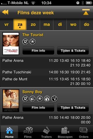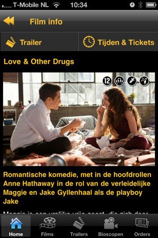 Ook de categorie Films is opnieuw vormgegeven. Bovenaan kun je nu sorteren op films die momenteel in de biscoop draaien (Nu), worden verwacht, de top 10 films of gewoon op alfabetische volgorde. Tevens heb je nu de mogelijkheid om te zoeken op films door middel van de titel, de acteur of andere trefwoorden. Hetzelfde geldt ook voor de categorie Trailers. Met het knopje ‘Film info’ krijg je meer informatie over een film en via ‘Tijden & Tickets’ zie je wanneer de desbetreffende film in jouw bioscoop draait. De oplettende gebruiker ziet ook dat de icoontjes voor de verschillende tabjes zijn veranderd. Tevens is er nu volledige ondersteuning voor iOS 4 toegevoegd en ondersteunt de applicatie het hogereresolutiebeeldscherm (retina display) van de iPhone 4 en laatste generatie iPod touch.