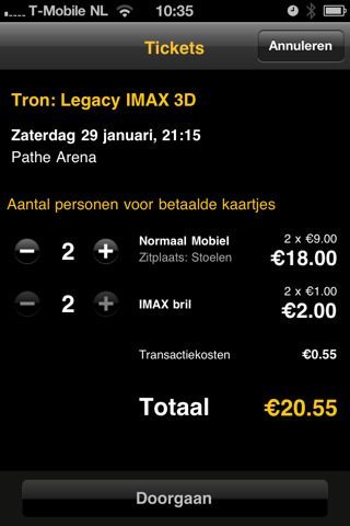 Een andere belangrijke nieuwe toevoeging is de mogelijkheid om vanuit de applicatie bioscoopkaartjes te bestellen en deze meteen af te rekenen. Hiervoor kies je een film uit die je wilt zien en vervolgens druk je op het knopje ‘Tickets’. Hierna verschijnt een nieuw schermpje waarin je je naam en e-mailadres moet invoeren. Naar dit e-mailadres wordt de boekingsbevestiging verstuurd. Daarna kun je aangeven hoeveel kaartjes je wilt reserveren. Betalen kan met PayPal, Hyves Afrekenen of een creditcard. Abonnees van Pathé Unlimited (onbeperkt naar de bioscoop voor €18 per maand) kunnen met een aparte knop kaartjes bestellen.