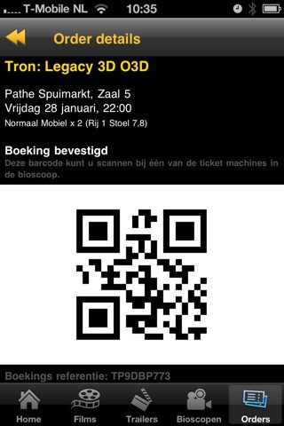 Kaartjes die je hebt gekocht verschijnen in de nieuwe Pathé Mobiel-applicatie in een apart tabje, Orders. Hier vind je ook alle informatie die voor jou als bezoeker relevant is, zoals de gereserveerde rij en stoel(en) evenals een boekingsreferentie. Ook wordt per boeking een barcode weergegeven die je in de bioscoop kunt laten scannen. Met het knopje bovenaan de Orders-categorie, kun je alle orders in één keer verwijderen of de instellingen, je persoonsgegevens of Pathé Unlimited Card, wijzigen.