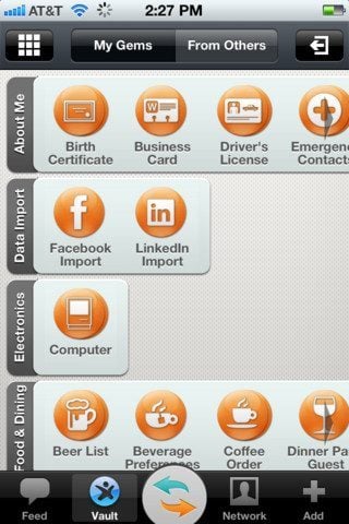 Zowel op de bijbehorende website van Personal, waarop je je accountregistratie moet bevestigen na een melding in je mailbox, als in de net uitgebrachte iPhone-app, kan je gems aanmaken en beheren. Dat doe je in de applicatie met het rechter tabblad Add, waarna je toegang krijgt tot Gemware, een soort App Store voor gems. Daar kan je aan de hand van subcategorieën als algemene informatie (bijvoorbeeld visitekaartje, kopie rijbewijs, contactgegevens voor noodgevallen, login & wachtwoorden, ledenpasjes), Data Import (Facebook en LinkedIn), Electronics (gegevens van je router, softwareversies), Health (allergieën, tandarts, zicht), kinderen, rekeningen, je favoriete koffie, je restaurantlijst, wijnfavorieten, hotelervaringen, auto-ongelukken, verzekeringen en nog veel meer, je hele hebben en houden kwijt.