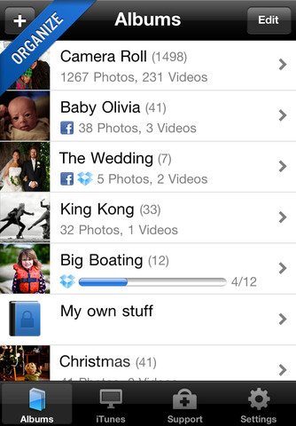 Gebruikers van een zeker populair sociaal netwerk, zullen enthousiast zijn over de optie om albums te maken en in één keer op Facebook te zetten. Je kan meerdere foto’s selecteren en meteen in een nieuw album plaatsen. De albumnaam is ook de naam die het gezelschap op Facebook meekrijgt. Een andere optie is dat albums online opgeslagen worden op de online opslagruimte Dropbox. Indien gewenst, kunnen albums in de app ook een slotje met wachtwoordvergrendeling krijgen. In het overzicht op datum worden ze dan niet meer weergegeven. Een beetje knullig is dit wel, want dezelfde foto’s zijn natuurlijk nog gewoon zichtbaar in de standaard foto-applicatie die Apple voorgeïnstalleerd heeft op de iPhone. Albums kunnen gewijzigd en in een eigen gewenste volgorde gezet worden.