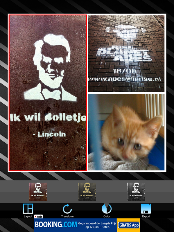 Wanneer je de app opstart heb je de keuze uit ongeveer 30 layouts. Ieder van deze bevat een bepaald raster waarin je foto’s worden opgedeeld. Wanneer je er een gekozen hebt wordt deze in volledige resolutie geopend, waarna je zelf foto’s mag toewijzen. Dit doe je door twee keer te tappen op een lege plek in een collage. Heb je de foto toegevoegd, dan kun je hem ook nog roteren, anders positioneren en hem met behulp van filters sepia of zwart-wit maken.