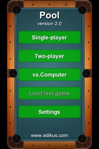 In Pool 2.0 heb je drie mogelijkheden: je kunt alleen, tegen een andere speler of tegen de computer spelen. Na het kiezen van het aantal spelers geeft je aan welk type spel je wilt spelen: met 8 of 9 ballen. Je kunt ook meteen zien hoeveel games je vandaag nog mag spelen.