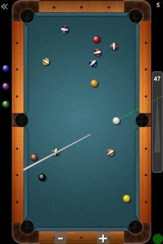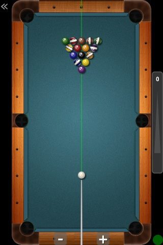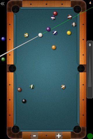 Na het richten van de keu ’trek’ je aan de schuifbalk rechts in beeld om de kracht in te stellen; een waarde tussen 0 en 100. Zodra je de schuifbalk loslaat wordt je bal weggeschoten. Een groen cirkeltje geeft aan welke speler aan de beurt is, wanneer je met z’n tweeën speelt.