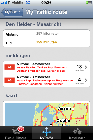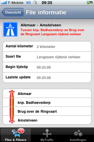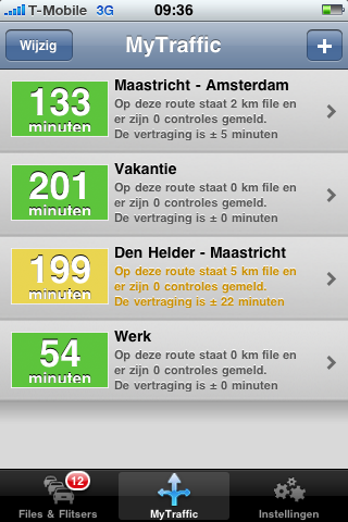 Wanneer je de applicatie opent krijg je eerst het totaaloverzicht van files en flitsers te zien. Na het invullen van je gebruikersnaam en wachtwoord van Routenet kun je de knop MyTraffic gebruiken. Hier zie je een overzicht van je eigen ingevoerde routes. Daarnaast wordt de verwachte reisduur getoond, rekening houdend met de huidige files en blokkades door bijvoorbeeld ongevallen of wegwerkzaamheden. De gegevens kun je automatisch laten verversen.