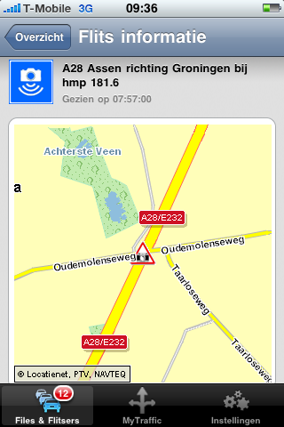 Bij de details van een flitslocatie of file zie je op een kaartje precies waar en hoe lang het oponthoud is of bij welke hectometerpaal de flitser staat. Je kunt ook via Twitter of door het sturen van een e-mail, anderen op de hoogte stellen van de locatie van de flitser of file. De makers laten verder weten dat er gewerkt wordt aan push notificaties zodat je een bericht krijgt als er op je route een vertraging optreedt. Dit komt in een volgende versie.