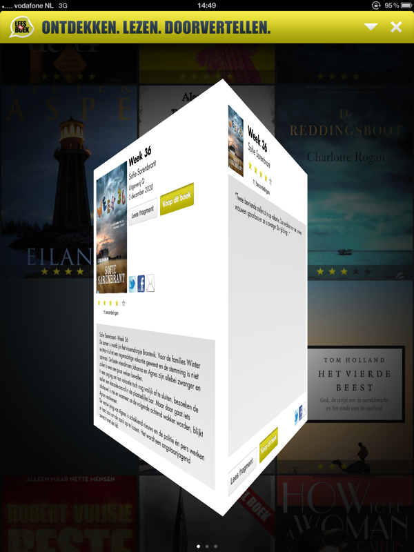 Als je op een boek klikt, draait hij uit de etalage en komt hij naar voren. Je ziet meer informatie met een korte samenvatting van de inhoud, de mogelijkheid om een stuk te lezen, knoppen om het boek te delen en uiteraard de optie om het boek te kopen. Ook hier kun je door te swipen het boek draaien. Je krijgt dan meer informatie over de schrijver te zien en ook de quotes die het boek beschrijven zijn terug te vinden.
