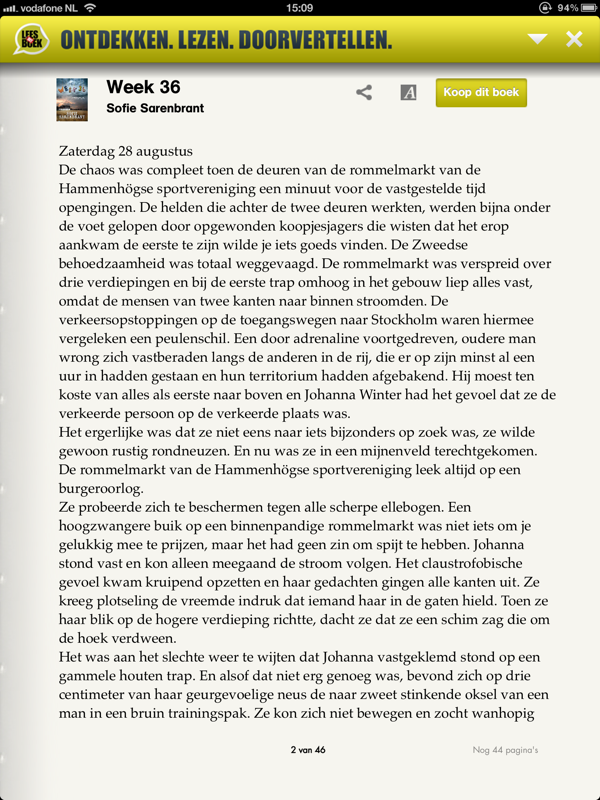 De reader werkt verder prima, maar hij is wel erg minimaal. Elke vorm van indexering ontbreekt bijvoorbeeld ook, wat vervelend kan zijn als je het (complete) gratis boek wilt lezen. Bladeren kun je doen door te swipen vanaf de zijkant van je scherm of door te tappen aan de zijkant. Vanuit de reader kun je het boek ook weer delen via social media en mail en de knop om het boek te kopen is uiteraard ook aanwezig.