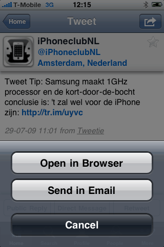 Er is ook meer nagedacht over de indeling van de buttons. Er is gekozen voor een andere indeling en er zijn wat buttons toegevoegd. Nadat je een tweet hebt geopend, heb je de mogelijk om hierop te reageren, iemand een Direct Message te sturen of te retweeten. Deze functies zaten voorheen rechts bovenin verscholen in een klein knopje waar je op moest drukken om deze opties te bekijken. Dat knopje zit er nog wel, maar geeft je nu de mogelijkheid om de desbetreffende tweet te bekijken in je Safari-webbrowser, of via de e-mail te sturen naar mensen die geen Twitter gebruiken.