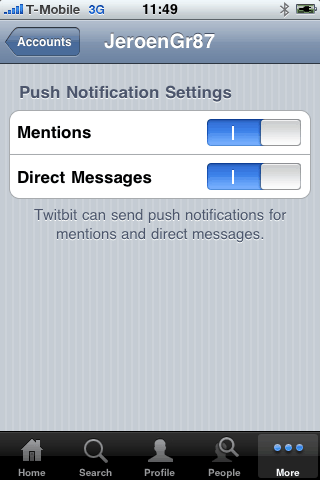 @Mike: Boxcar heb ik ook geprobeerd maar zit vertraging tussen. (soms wel 5 min.) En waarom moet er weer een applicatie tussenkomen die ervoor zorgt dat je wel Push-notificaties kunt ontvangen. Twitbit zit nagenoeg geen vertraging tussen. Opzich lijken en zijn alle Twitter applicaties nagenoeg hetzelfde. Heb een tijdje Beejive en IM+ gehad, maar dat vindt ik pas weggegooid geld. Wat een onoverzichtelijke bedoeling. Waarom je over zou moeten stappen naar Twitterapp? Ieder zijn ding, maar ook (let op! OOK, ALLEEN) het feit dat de ontwikkelaar aardig wat tijd erin heeft gestoken om te helpen dat iedereen (en ook ondergetekende) eerder heeft kunnen helpen aan de update is een nette service. “Belstatus” en “Trein” hebben meer dan eens er lange tijd uit gelegen.