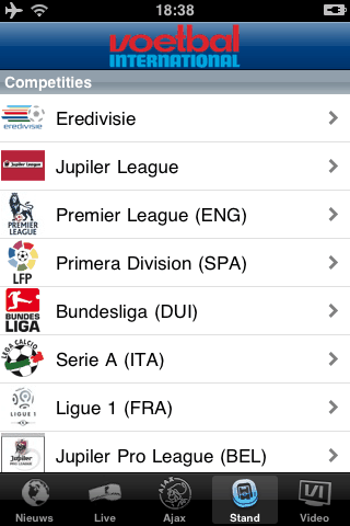 Misschien wel het leukste onderdeel van de applicatie is het laatste tabblad, Video. Hier vind je de dagelijkse videocolum van de man die door velen liefkozend ‘de snor’ wordt genoemd: Johan Derksen. Daarnaast kun je een 5 minuten durende samenvatting bekijken van het tv-programma Voetbal International en de video-items van ‘Tussen de Linies’ (Tom Knipping en Iwan van Duren). Eén minpuntje daarbij: de beeldverhouding van de video’s is niet helemaal goed, zodat het lijkt alsof de mensen in de lengterichting zijn opgerekt. Misschien een truc om te zorgen dat iedereen er graatmager uitziet, maar het ziet er niet natuurlijk uit.