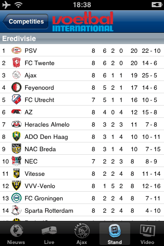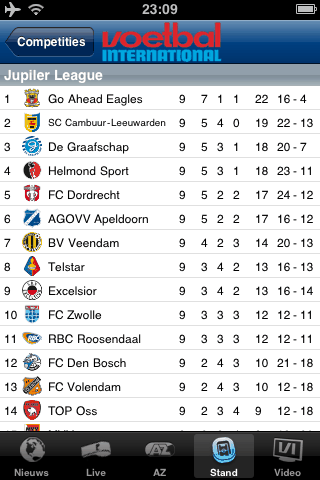 Het tabblad Stand is eigenlijk weer een kopie van het eerder genoemde tabblad Live, maar met een stuk minder competities. Hier zijn maar 9 competities aanwezig, van Eredivisie tot de Turkse Süper Lig. De applicatie toont de complete standen, bijgewerkt tot op de dag van vandaag. Ook hier kun je alleen een lijst bekijken, zonder dat je op de clubs kan tappen voor meer informatie. Topscorers, aantallen rode/gele kaarten en andere achtergrondinformatie zul je dus ergens anders moeten halen.