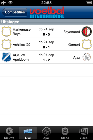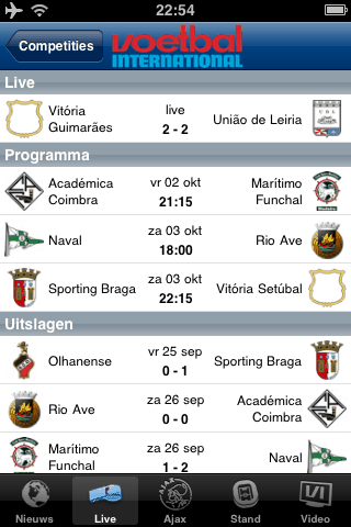 Het is jammer dat er op dit moment geen wedstrijden zijn, want dan had ik kunnen zien hoe snel de scores en de standen worden bijgewerkt. Waarschuwingen bij doelpunten krijg je nog niet (dat zit in de eerder genoemde Alert-versie). Wel kun je de actuele scores van 40 competities zien, waarbij de informatie automatisch wordt bijgewerkt. Een voetbalfluitjesicoon achter een competitie geeft aan dat er nieuwe informatie is, bijvoorbeeld live scores of zojuist gespeelde wedstrijden waarvan de eindstand bekend is. Naast de bekende leagues zoals Eredivisie, KNVB Beker, Premier League en de Serie A zie je ook de minder bekende competities, zoals de tweede Bundesliga van Duitsland, Noorwegen, Brazilië, de Coupe de France of de WK Kwalificatie 2010. Elke lijst met competitie-info bestaat steeds uit twee of drie onderdelen: Live (indien beschikbaar), Programma (wedstrijden van de komende week) en Uitslagen (van ca. de afgelopen week). Je kunt niet op een wedstrijd tappen om meer informatie te zien.