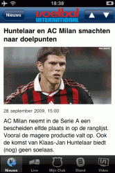 Voetbal International toont bij het opstarten een interface met vijf knoppen onderin het scherm: Nieuws, Live, Club, Stand en Video. Het onderdeel Nieuws is te vergelijken met wat we bij veel krantenapplicaties voor de iPhone aantreffen: kleine foto’s met daarnaast een nieuwtje. Bovenaan de pagina vind je de drie belangrijkste nieuwtjes, die iedereen gelezen moet hebben. Daaronder staat een lijst met de overige nieuwsberichten van de afgelopen 24 uur. De redactie schrijft behoorlijk door, want er staan bijna 30 actuele nieuwsberichten op je te wachten. Open je zo’n nieuwsbericht, dan krijg je nogmaals een foto en het nieuwsitem zelf te zien, maar er is geen mogelijkheid om berichten te markeren, delen, twitteren of andere interactiemogelijkheden uit te voeren.