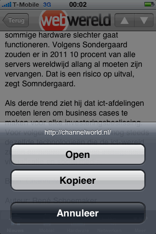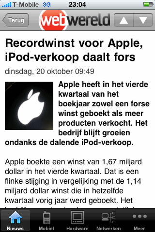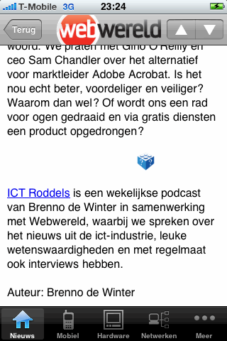 Bij het openen van een nieuwscategorie verschijnen de 20 laatste artikelen, voorzien van een klein fotootje. Tik je daarop, dan kun je het complete artikel lezen. Reacties lezen is niet mogelijk en zelf reageren evenmin. In de artikelen zelf zijn behoorlijk wat hyperlinks opgenomen. Tik je daarop, dan sluit de Webwereld-applicatie waarna je in de Safari-browser terechtkomt. Dat is niet helemaal netjes, want je komt op een versie van de website terecht die niet voor mobiel gebruik is geoptimaliseerd. Het was mooier geweest als The Saints de nieuwe pagina in een geïntegreerde browser had getoond, want nu word je bij de eerste de beste actie alweer uit de Webwereld-applicatie weggestuurd. De recente artikelen worden in de applicatie in geoptimaliseerde weergave getoond, dus het kán wel. Bovendien is er gewoon een mobiele versie van de website, te vinden via mobile.webwereld.nl. De auteurs van Webwereld zijn gewend om veelvuldig te linken naar bronnen en eerder gepubliceerde artikelen, dus de verleiding om tijdens het lezen van een artikel toch even op een linkje te klikken, is behoorlijk groot… met als gevolg dat je in Safari zit en vervolgens de native applicatie weer handmatig moet opstarten.