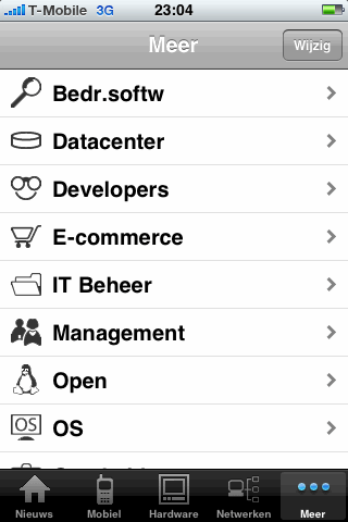 Ontwikkelaar The Saints vroeg ons om de iPhone-applicatie van Webwereld te reviewen. Voor mensen die niet van eindeloos lange reviews houden, is er goed nieuws: we zijn in drie alinea’s klaar. De applicatie bevat namelijk opvallend weinig functionaliteit, in vergelijking met de meeste andere nieuwsapplicaties. Webwereld toont op de iPhone steeds de twintig laatste artikelen in de nieuwscategorieën die de website hanteert. Standaard heb je vanuit de applicatie snelle toegang tot de categorieën Nieuws (alles), Mobiel, Hardware en Netwerken, via zwarte knoppen onderin het scherm. Is Security of Storage meer jouw vakgebied, dan kun je via de knop Meer toegang krijgen tot deze extra categorieën. Net als bij andere nieuwsapps kun je zelf kiezen welke knoppen je onderin het scherm wilt zien.