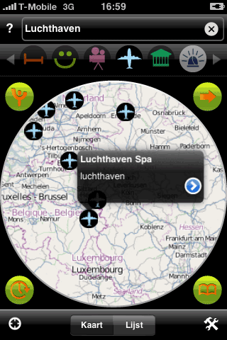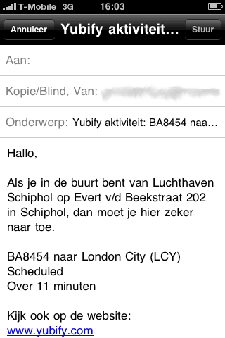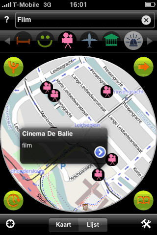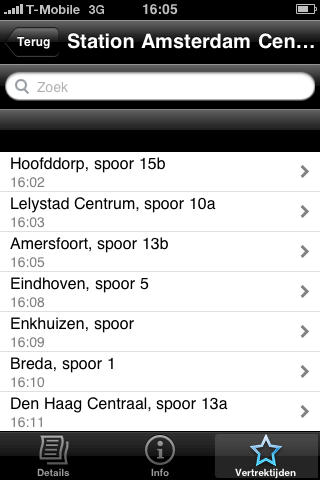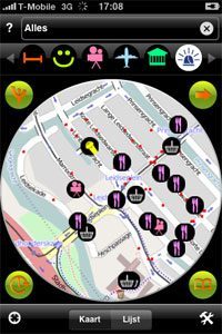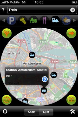 Stations in de buurt.Volgens Yubify-bedenker Daniel Polak is Yubify niet alleen een iPhone-applicatie, maar is het een nieuw soort platform zoals het world wide web een platform is. Dat klinkt nogal ambitieus en ik vrees ook dat Yubify bij de eerste release moeite zal hebben om het waar te maken. In eerste instantie zie je namelijk gewoon een locatiegebaseerde applicatie, met icoontjes op de kaart waar het dichtsbijzijnde restaurant, treinstation of museum is. Pas als je dieper graaft ontdek je de extra informatie die erachter schuilgaat. Maar dat is niet de enige uitdaging, want Yubify gaat in eerste instantie voor een paar killer feeds: de informatie die mensen het meest nuttig vinden, zoals de live vertrek- en aankomsttijden van vliegvelden (niet alleen van Schiphol, maar ook van Eelde, Rotterdam en andere Nederlandse vliegvelden), de vertrektijden van treinstations, locaties van hotels, restaurants, bioscopen, musea, noodmeldingen van P2000 en andere populaire feeds. Daarna kunnen verkeersinformatie en flitsers, multimodale reisinformatie en andere feeds volgen. Yubify verdient straks geld uit de transacties.