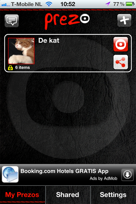 Prezo kan zijn nut in meerdere situaties bewijzen, maar het ontwerp zal nogal wat potentiële gebruikers afschrikken: de cartoony witte letters op de zwarte achtergrond van de app zien er namelijk niet heel fraai uit. Gelukkig kun je vanuit de instellingen van de app een neutraler lettertype selecteren. De app is gratis, maar toont wel reclameberichten onderin het scherm.