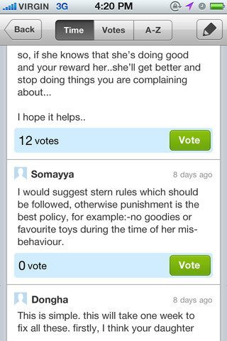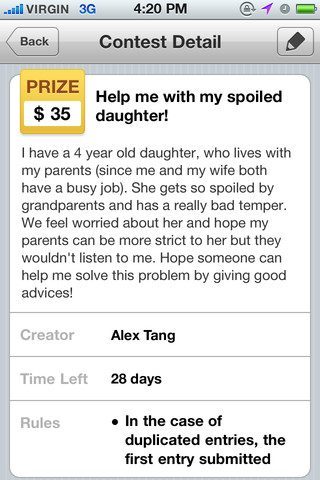 Een eigen antwoord inzenden is net zo eenvoudig. Je drukt op het pennetje rechtsboven, typt je antwoord en kan die voorzien van beeldmateriaal dat je rechtstreeks upload vanaf de telefoon. Als het bericht verzonden is, ververs je de pagina en staat je inzending bovenaan. Als je wint, heb je een PayPal-account nodig om het geld te ontvangen. We hebben helaas niet kunnen testen of het invoeren van die gegevens in de applicatie zelf aan bod komt.