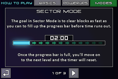 Er zijn vier verschillende modi in Sigma. Ieder van deze modi kent drie moeilijkheidsgraden. De eerste mode heet Sectors. In deze mode is je doel zo snel mogelijk de progressiebalk te vullen, door zo veel mogelijk punten te scoren. Doe je dit snel genoeg, dan zul je een volgende sector vrijspelen. Deze sectoren hebben helaas geen nieuwe functionaliteiten, maar wel een nieuw thema en muziekje.