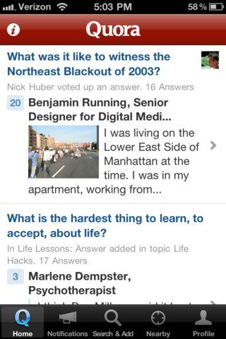 Wat is het slechtste voorbeeld van toegepast design? Moeten de verkoopcijfers van de Amazon Kindle Fire bij het marktaandeel van Android op tablets worden opgeteld? Wat is de impact van chauvinisme op de Eredivisie? Is het met de huidige technologische kennis mogelijk om Batman te worden? Quora, een vorm van kennis delen op het internet, heeft een eigen applicatie uitgebracht voor de iPhone. Daarin kunnen gebruikers intelligente vragen stellen en beantwoorden.