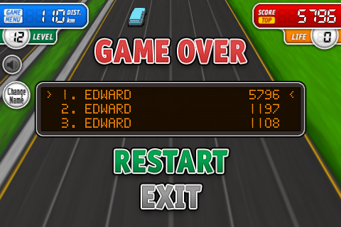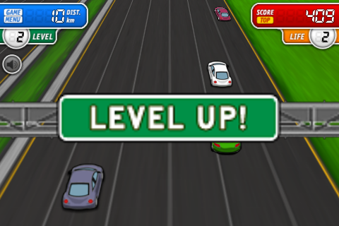 Deze score wordt weergegeven op een online leaderboard, hiermee kun je je eigen score vergelijken met andere spelers van het spel. Bij de instellingen kun je de geluidseffecten en trillingen (bij een botsing) uit of aan zetten. Ook kun je hier de moeilijkheidsgraad kiezen en de kleur van je auto. Je krijgt punten door zo lang mogelijk op de weg te blijven en bonuspunten voor het op het laatste moment ontwijken van de andere auto’s. Er zijn geen andere obstakels of verdere opdrachten die je moet halen of levels die er anders uitzien. Desondanks is het toch een leuke besteding van je 79 cent.