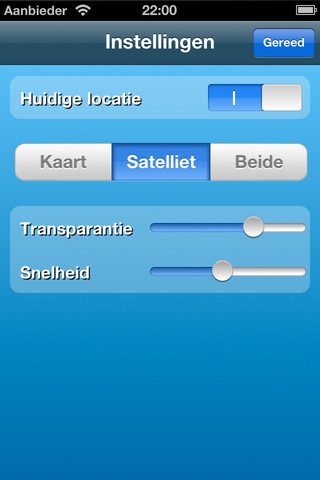 In onze testsessie van de app Regen was er praktisch geen wolkje aan de lucht. De witte wolken die er wel waren, verdwenen geheel in de lichtgrijze kaartweergave van Regen. Gelukkig kun je de kaarten van Google Maps ook in satelliet of combinatie-weergave bekijken en dat is in Regen niet anders. Met de locatiefunctie onder de info-knop rechtsboven kun je meteen je locatie op de kaart aangeven. Dat is handig om uitgezoomd het grote plaatje te zien, maar het is ook makkelijk om zo snel naar de goede plek in te zoomen.