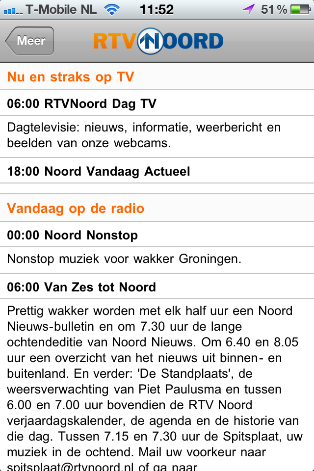 Ook heeft de RTV Noord-app een TV-Gids met een overzicht van de tv-programma’s van de omroep. De meeste omroepen hebben ook een video- of audiostream in hun applicatie ingebouwd. Als je over minimaal iOS 4 beschikt, kun je de livestream van een omroep ook op de achtergrond laten doorspelen.