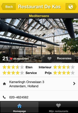 De gemiddelde score van een restaurant laat natuurlijk wel iets zien over de kwaliteit ervan. Ook de sterrenwaarderingen en het aantal personen dat een restaurant een hartje geeft, helpt mee een keuze te maken. Op moment van schrijven zijn er echter nog weinig waarderingen en zien we onder de zoekopdracht Groningen zelfs een ‘exclusief restaurant’ dat een onvoldoende scoort. Natuurlijk heb je vanuit de app ook de mogelijkheid zelf een recensie met sterrenwaarderingen achter te laten.