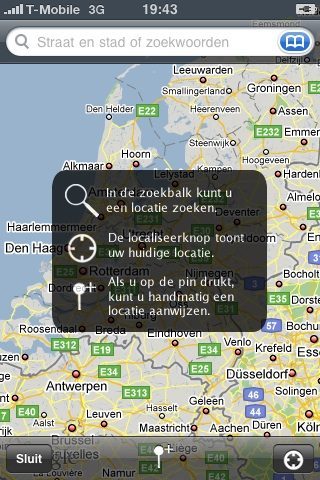 Wat erg handig is, is dat je van het vertrekpunt, eindpunt en elke overstaphalte een kaartje te zien krijgt, waarmee je precies kunt zien hoe je moet lopen. Een groen pijltje geeft aan waar je staat, een rood pijltje laat zien waar je bestemming is. Een blauw bolletje volgt je tijdens het lopen op de kaart. Bij gebruik van een iPhone 3G of 3GS is de plaatsbepaling natuurlijk het meest nauwkeurig, omdat daarin een GPS-ontvanger is ingebouwd.