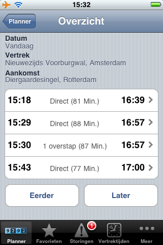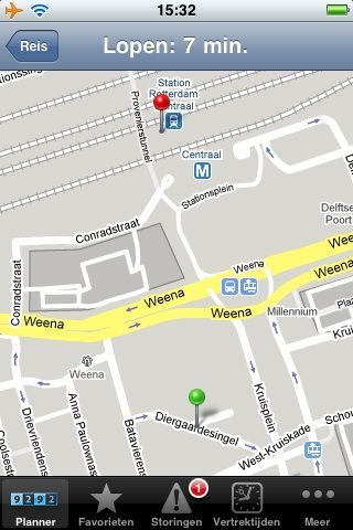 Bij elke geplande reis krijg je 4 opties. Met Eerder en Later kun je de tijdstippen verschuiven.Naast de betaalde Pro-versie van de applicatie zal ook de gratis 9292ov GPS een update krijgen. Deze applicatie is gekoppeld aan de mobiele site mobiel.9292ov.nl: na het starten van de app en het bepalen van je actuele locatie word je doorgestuurd naar de mobiele website. Die mogelijkheid blijft nog steeds aanwezig, ook in versie 1.3 (die over een paar dagen in de App Store verschijnt). De mobiele website biedt echter veel minder functionaliteit: je krijgt alleen een kaartje van de aankomsthalte te zien (niet van de vertrek- en overstaphaltes), de tarieven staan er onoverzichtelijk in en je kunt niet op de kaart een bestemming aanwijzen. Wel zul je even moeten wennen aan de invoerwijze van het adres: bij de mobiele website vul je ‘Rotterdam, Weena’ in terwijl dat in de mobiele applicatie ‘Weena, Rotterdam’ moet zijn.