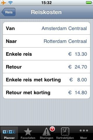 De leidende OV-applicatie in de App Store is zonder enige twijfel Trein, van Dennis Stevense. Hoe verhoudt 9292ov Pro zich tot Trein als we uitsluitend naar reizen met dit vervoermiddel kijken? Qua interface is 9292ov Pro voor een deel schatplichtig aan Trein; de applicaties lijken vrij veel op elkaar. De verschillen zitten vooral in de nuances: in het scherm ‘Planner’ (bij 9292ov Pro) mist bijvoorbeeld een ‘Via’-optie die wel in ‘Reis plannen’ (Trein) voorkomt. Daarentegen ontbreekt (uiteraard) de knop ‘Vervoerstypen’ weer in Trein en heeft 9292ov Pro ervoor gekozen de knoppenbalk in beeld te houden. Beide applicaties kunnen een reisadvies via e-mail versturen: Trein doet dit via de Mail-applicatie, 9292ov Pro vanuit de applicatie zelf (een van de nieuwe mogelijkheden van iPhone-firmware 3). Een sterk punt van 9292ov Pro is dat deze applicatie ook de reiskosten voor je gekozen traject toont. Daarentegen vinden we de schermen van Trein op veel punten duidelijker, met name als het puur om het reisadvies gaat. Voorlopig zijn deze applicaties dan ook wel complementair aan elkaar, maar 9292ov Pro heeft twee pro’s ten opzichte van Trein: de aankomende realtime-updates en het feit dat de gegevens echt door de aanbieder zelf ter beschikking zijn gesteld (in tegenstelling tot Trein, die de gegevens van de NS-website afhaalt en waarbij de ontwikkelaar bij elke grote aanpassing van de NS weer een nieuwe oplossing moet verzinnen).