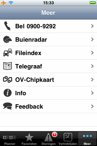 Via de knop Meer krijg je een lijstje met extra’s in beeld, zoals linkjes naar de mobiele websites van Buienradar, Fileindex, Telegraaf en OV-Chipkaart. De link met weer en verkeer is nog wel te begrijpen, maar ik ben er (ook na langere tijd erover nadenken) nog niet uit waarom je 9292ov zou opstarten om de headlines van De Telegraaf te lezen. Misschien om de tijd te doden tijdens het wachten op de bus, maar de meeste iPhone-bezitters hebben daar zelf wel een oplossing voor, variërend van VK Puzzels tot Minigore of gewoon de eigen iPhone-applicatie van De Telegraaf.