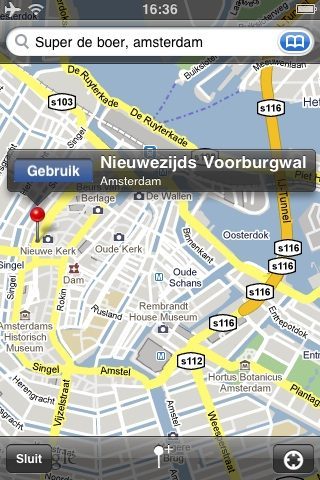 Er is nog een andere manier om het vertrek- of eindpunt in te voeren: door een pushpin op de kaart te zetten. Je kunt daarbij inzoomen en met je vinger zo goed mogelijk proberen te mikken op het gewenste punt. Raak je daarbij een straat, dan zal er een labeltje met de straatnaam verschijnen die je met een tap op ‘Gebruik’ selecteert.